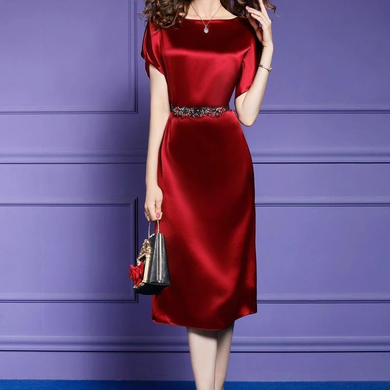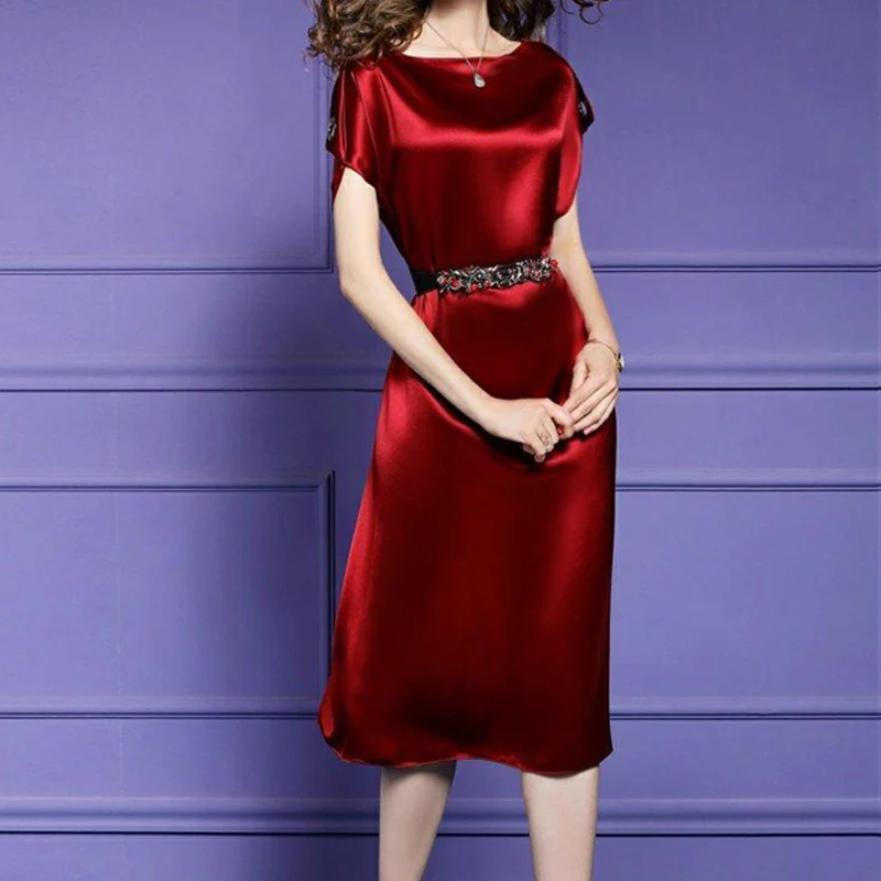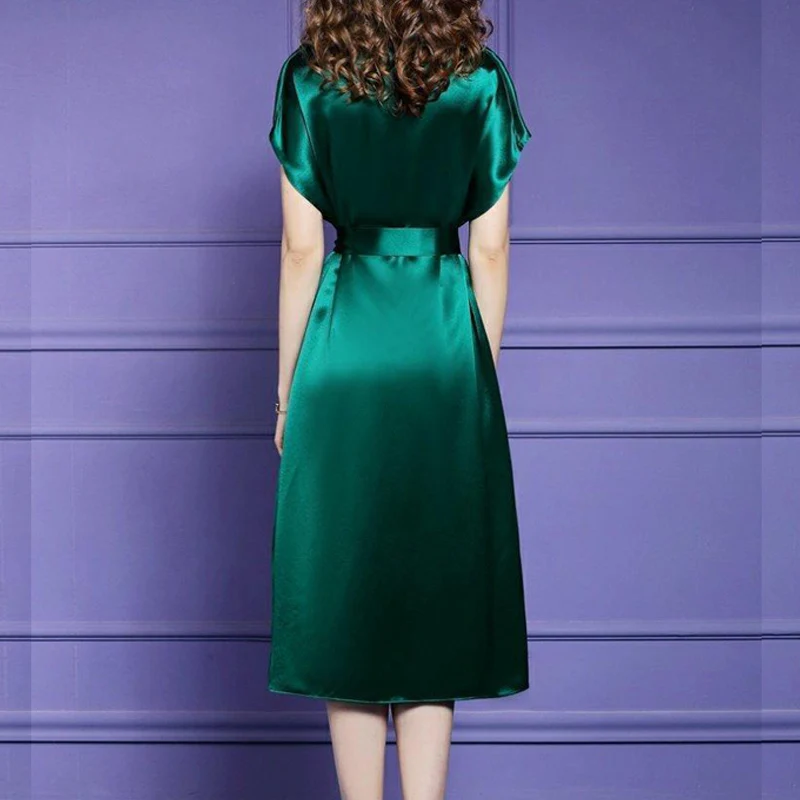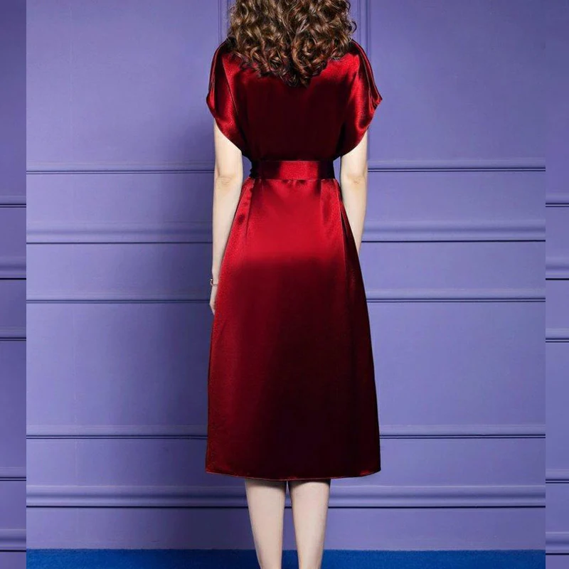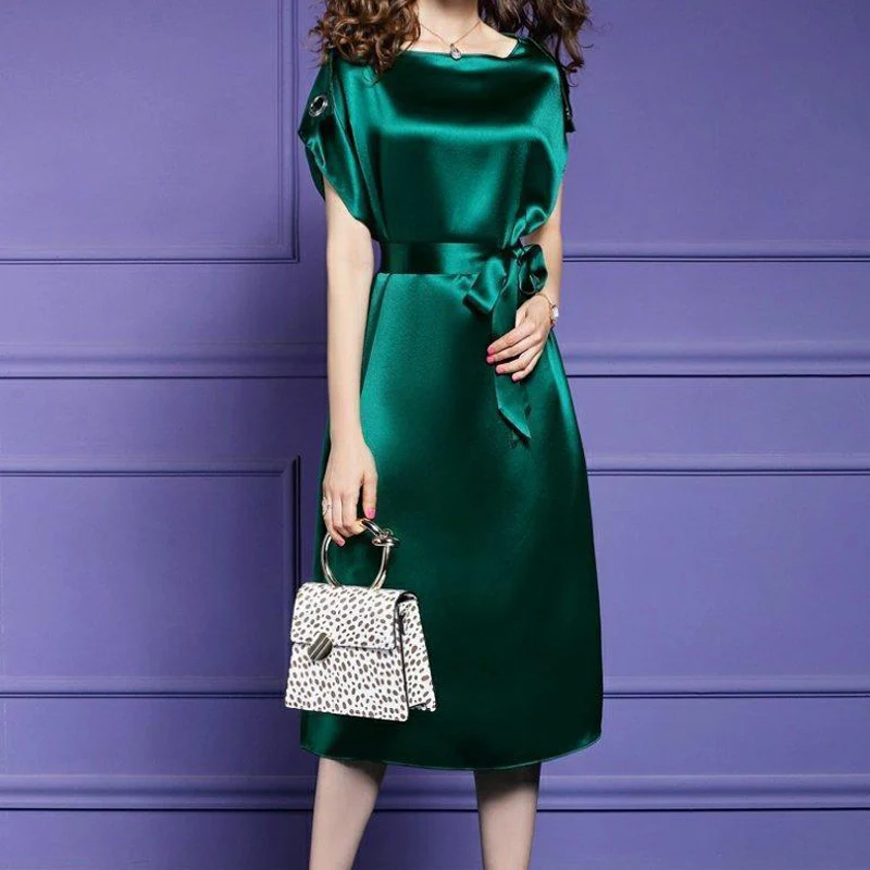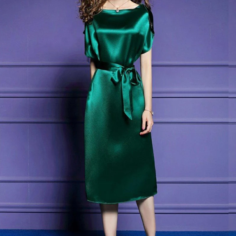 Satin Silk Vintage Elegant Temperament Lace-up Slim Fit Midi Dress Women New Summer Solid Party Dresses Vestidos Female Clothing